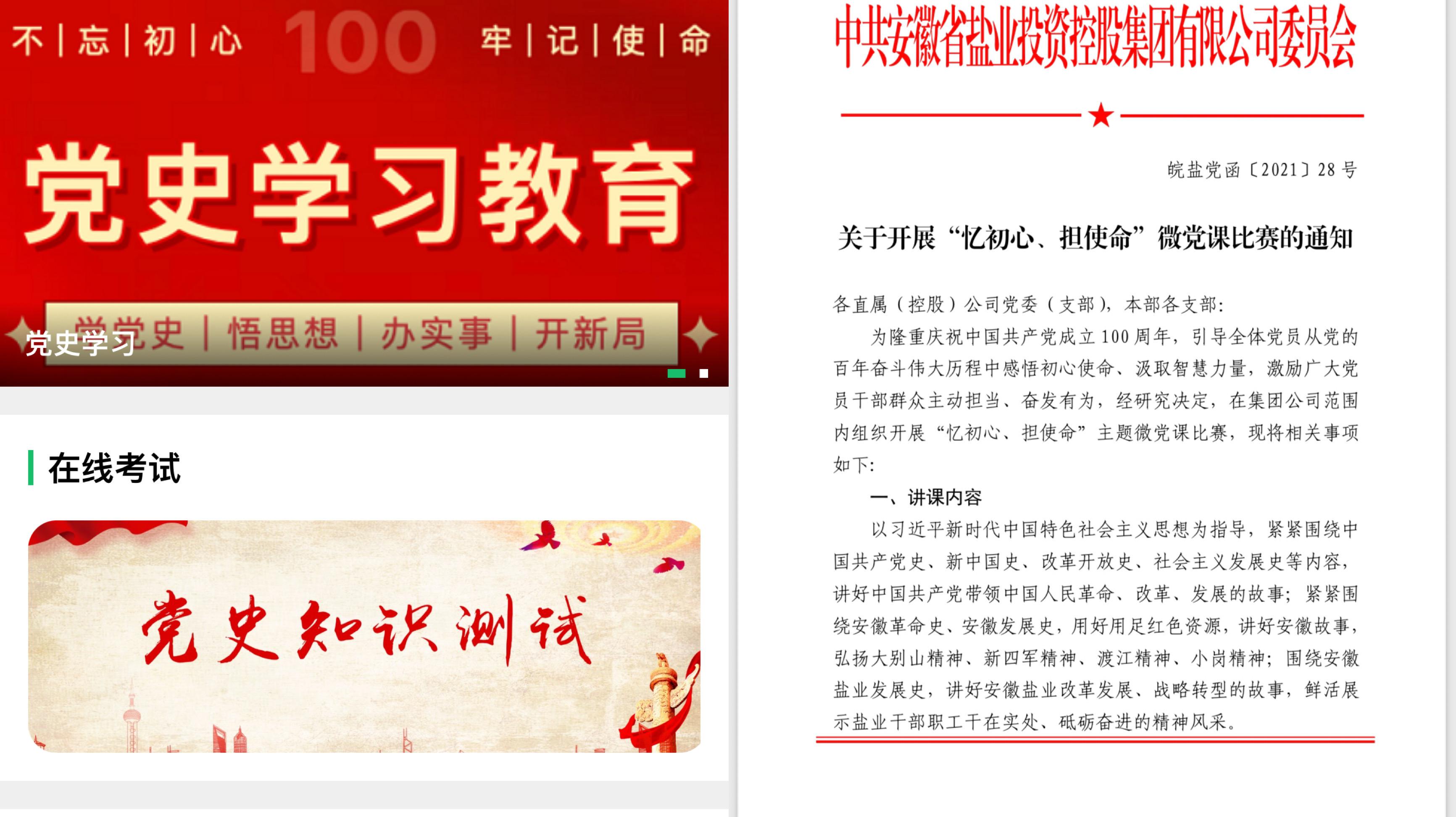 搭建平臺云端講。集團黨委不斷加強對“互聯(lián)網(wǎng)+”工作模式積極探索,在黨課方式方法上下功夫,力求黨課有深度見實效。今年3月,正式上線“鹽業(yè)學習強企”小程序,4月初開設(shè)黨史學習教育專欄,設(shè)中共簡史、歷史微故事、精神譜系三個學習專題,陸續(xù)發(fā)布中共簡史專題31篇,推送《新四軍智斗日本兵》、《湘江作證》等歷史微故事23個,專題解讀井岡山精神、長征精神等黨的精神譜系11篇,一個個鮮活的紅色故事走上“云端”,系統(tǒng)1000余名黨員“零距離”感受紅色力量。充分用好優(yōu)秀黨課云資源,將《百煉成鋼:中國共產(chǎn)黨的100年》微記錄片融入支部學習日常,以理論+視頻學習的方式,打開黨史記憶,傾聽百年回響。亢慕義齋油墨飄香、老漁陽里孕育初心......100個重要事件,100個歷史故事,以動畫、沙畫、情景再現(xiàn)的方式重現(xiàn),廣大黨員在生動的敘事中見證中國共產(chǎn)黨百年壯闊征程,汲取奮進新時代的智慧和力量。