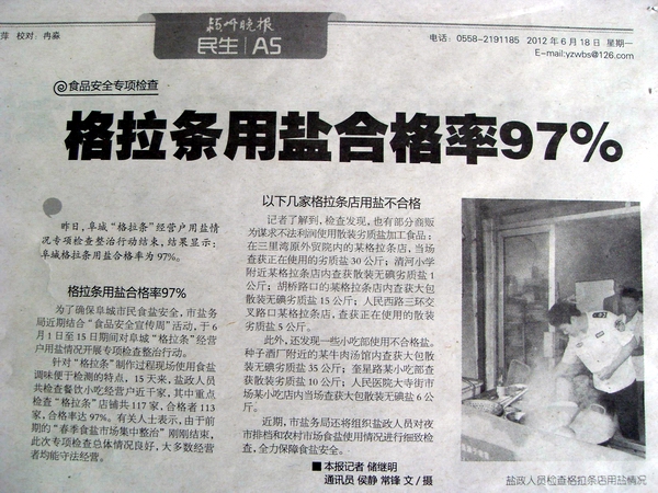 昨日,阜城“格拉條”經營戶用鹽情況專項檢查整治行動結束,結果顯示:阜城格拉條用鹽合格率為97%。