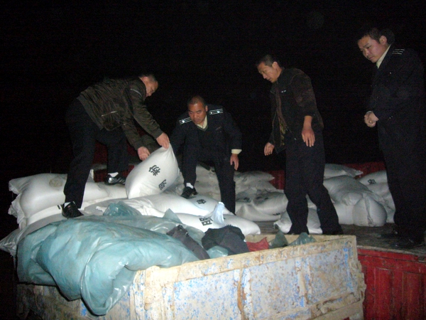 當(dāng)日夜,市鹽務(wù)局鹽政科接群眾舉報(bào),稱有人在聞集鎮(zhèn)兩河口附近交易工業(yè)鹽。潁泉鹽政聯(lián)系聞集派出所協(xié)助。在聞集鎮(zhèn)兩河口附近的河壩上,執(zhí)法人員發(fā)現(xiàn)有人正在從贛籍紅色解放牌大貨車上往機(jī)動(dòng)三輪車上卸白色袋裝物。執(zhí)法人員控制了現(xiàn)場(chǎng)人員和車輛,經(jīng)清點(diǎn)貨車上載有標(biāo)注“元明粉”的白色塑編袋鹽產(chǎn)品共計(jì)360包,約18噸,鹽產(chǎn)品經(jīng)現(xiàn)場(chǎng)碘試劑測(cè)試不含碘。