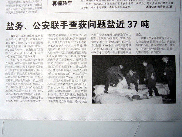 本報(bào)訊(記者 儲(chǔ)繼明 通訊員 李立軍 文/攝)日前,市鹽務(wù)局在潁泉警方的配合下,一舉查獲運(yùn)輸私鹽大貨車一輛、機(jī)動(dòng)三輪車一輛、搗毀窩點(diǎn)一個(gè)、查沒(méi)標(biāo)注“元明粉”、“Industrial salt”、“M.N.I”三種外包裝的不明鹽產(chǎn)品36.8噸。