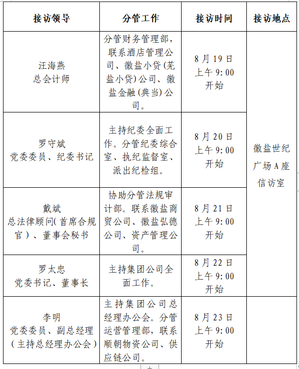 根據工作安排,現就省生態環境集團領導班子成員8月份接待群眾來訪安排公示如下: