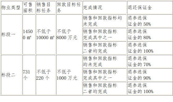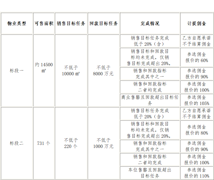 七、投標限價:本次比選文件中標段一和標段二所涉及的業(yè)態(tài)在合作期限、銷售完成目標、回款目標、分銷團隊人員配備、傭金計提點數(shù)、以及履約保證金等設定了最低報價指標,低于此指標的按廢標處理。