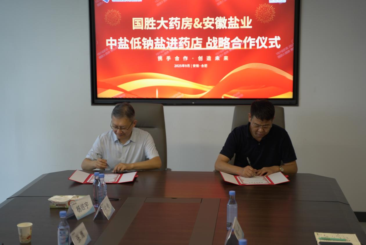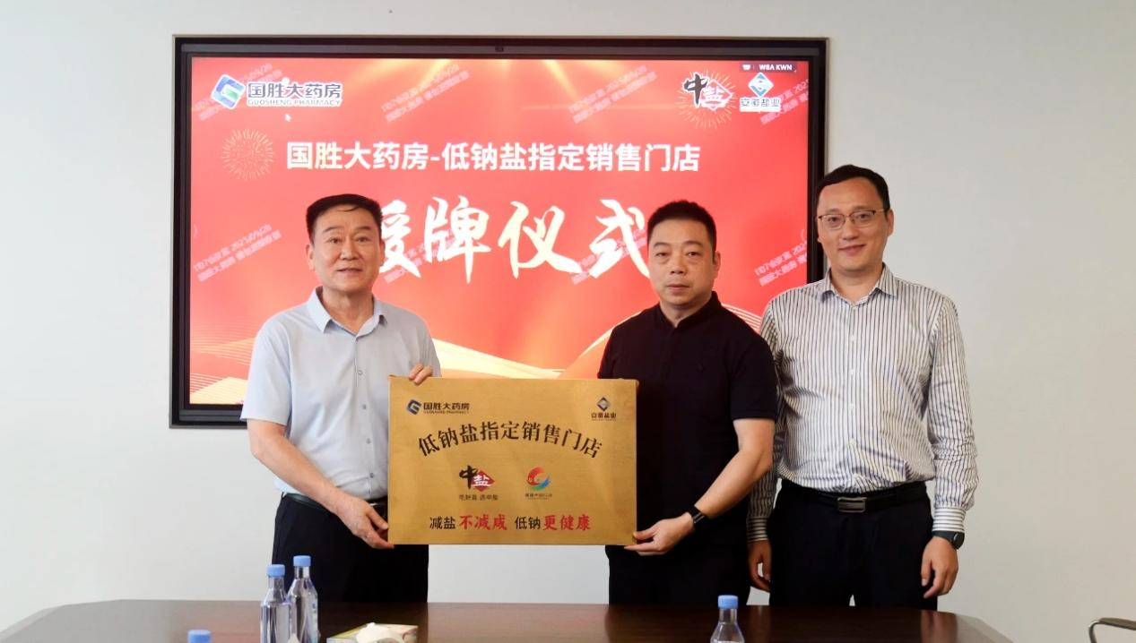 儀式現(xiàn)場,雙方圍繞“高鹽飲食危害防控”與“低鈉鹽全民推廣路徑”展開深入研討,達(dá)成了“政策同向、使命同頻”的戰(zhàn)略共識,共同致力于將健康干預(yù)覆蓋至家庭單元。隨后,安徽省鹽業(yè)集團(tuán)與國勝大藥房簽署了戰(zhàn)略合作協(xié)議,安徽省鹽業(yè)集團(tuán)與中鹽東興公司共同向國勝大藥房授予“中鹽低鈉鹽指定銷售門店”牌匾,宣告低鈉鹽的健康推廣與銷售在醫(yī)藥渠道正式啟動(dòng)。